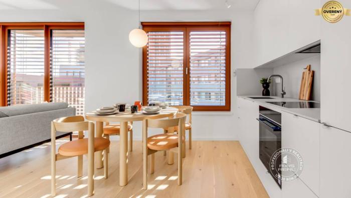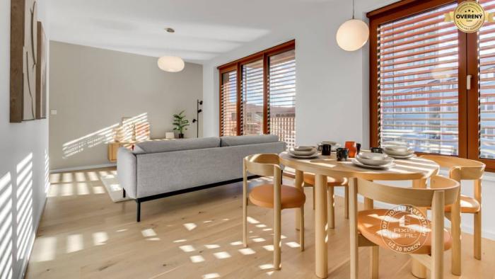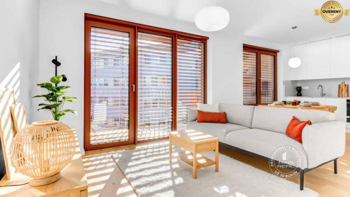 Byt je KOMPLETNE ZARIADENÝ a MODERNE vybavený. Je ÚPLNE NOVÝ a ešte nikto v ňom nebýval. V byte sú všetky spotrebiče kvalitných značiek, televízor je možné po dohode doplniť, chladnička s mrazničkou, umývačka riadu, indukčná varná doska, elektrická rúra, digestor, mikrovlnka, práčka s integrovanou sušičkou a základné vybavenie. Po dohode s majiteľom je možné doplniť stoličku k stolíku podľa využitia prípadne iný nevyhnutný doplnok zariadenia. NADŠTANDARDNÉ VYBAVENIE bytu: stropné chladenie, podlahové kúrenie, individuálne nastavenie teploty, drevené podlahy, sieťky, LED osvetlenie, elektricky ovládané vonkajšie hliníkové žalúžie, hliníkové okná, špičkový video-vrátnik s inteligentnou funkciou ukazovania aktuálneho počasia, dátumu a času. Možnosť využívať spoločnú miestnosť na odkladanie bicyklov aj dobíjanie a tiež aj komunitné priestory. Byt je vybavený a zariadený PRE VÁŠ MAXIMÁLNY KOMFORT.