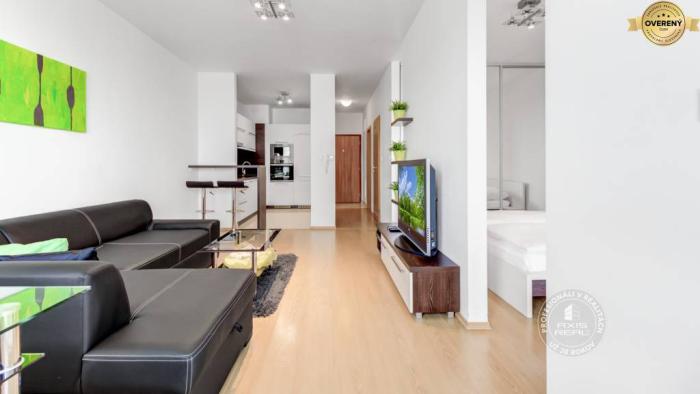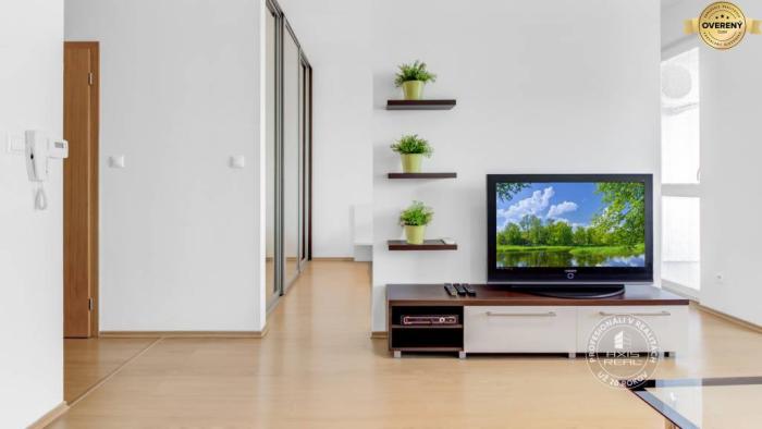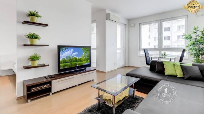 Byt je KOMPLETNE ZARIADENÝ nábytkom na mieru a MODERNE vybavený. V byte sú všetky spotrebiče kvalitných značiek, chladnička, mraznička, sklokeramická varná doska, elektrická rúra, digestor, mikrovlnka, kávovar, základné vybavenie a riad, 2x LCD TV (v obývačke aj spálni), práčka, vysávač, žehlička, žehliaca doska, sušiak na bielizeň a pod. PRE VÁŠ MAXIMÁLNY KOMFORT.