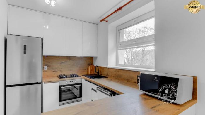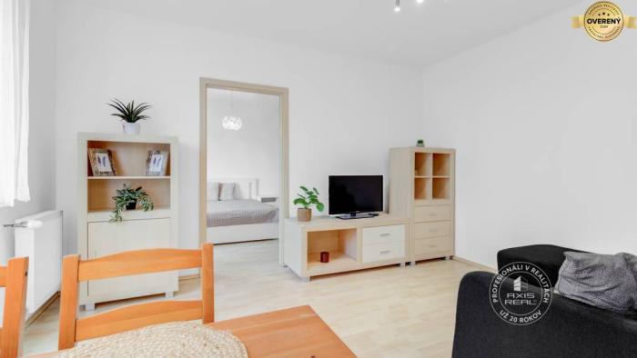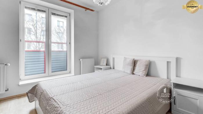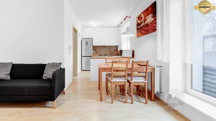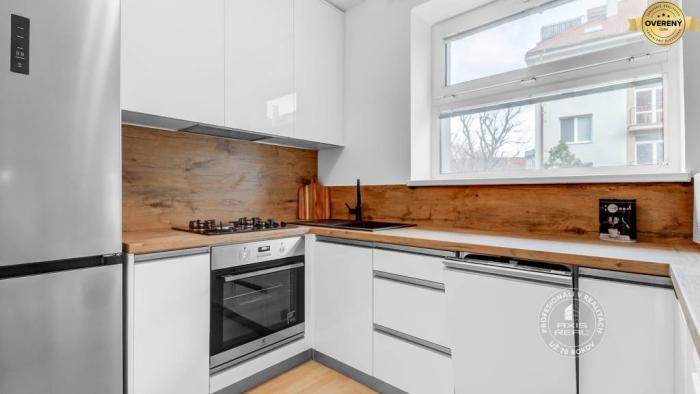 Tento svetlý a útulný byt je po čiastočnej rekonštrukcii. Má francúzske okná. Sú v ňom bezpečnostné dvere, plastové okná, plávajúca podlaha, kvalitná dlažba a sanita. Kúrenie, aj ohrev teplej vody je vlastným plynovým kotlom prostredníctvom radiátorov. Dostatok úložného priestoru – v chodbe je veľká vstavaná skriňa. Ďalšie úložné priestory sú v spálni. Súčasťou kuchyne je kompletne vybavená kuchynská linka. Spotrebiče: mikrovlnka, nový plynový sporák, nová elektrická rúra, nová umývačka, nová chladnička s mrazničkou, nová pračka. Samotný bytový dom je tehlový, zateplený, dobre udržiavaný.