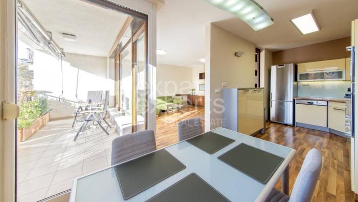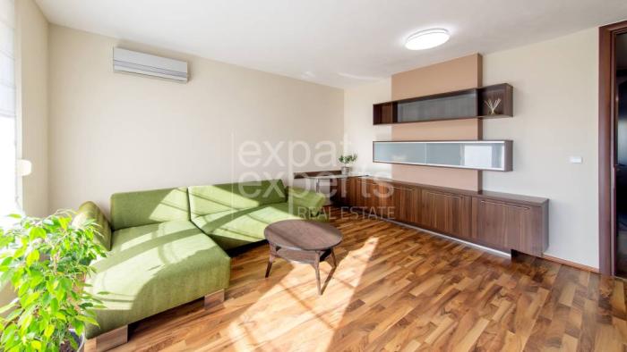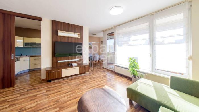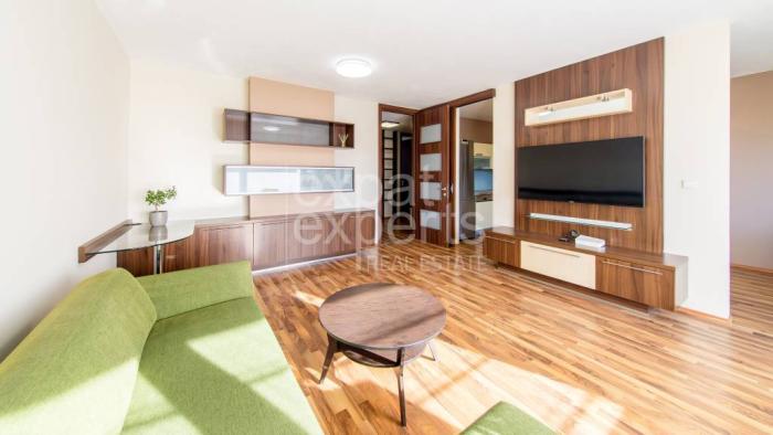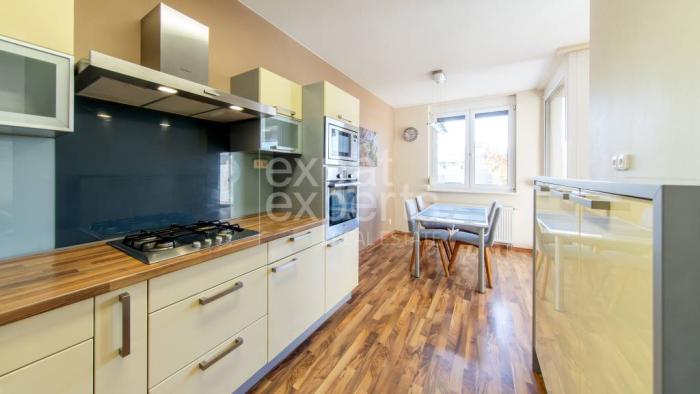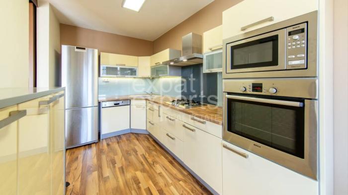 Byt má priestrannú vstupnú halu, z haly je priamy vstup do obývacej izby, s loggiou (9,9 m2), kuchyňou s jedálenskou časťou, detská izba, hlavná spálňa, kúpelňa (vaňa, umývadlo, toaleta, priestor na práčku a sušičku, samostatná toaleta s umývadlom, veľký šatník (police, vešanie). Veľkorysá kuchynská linka s množstvom odkladacieho priestoru je vybavená spotrebičmi (zabudovaná varná doska, digestor, vstavaná elektrická rúra, umývačka riadu, samostatná chladnička s mrazničkou).