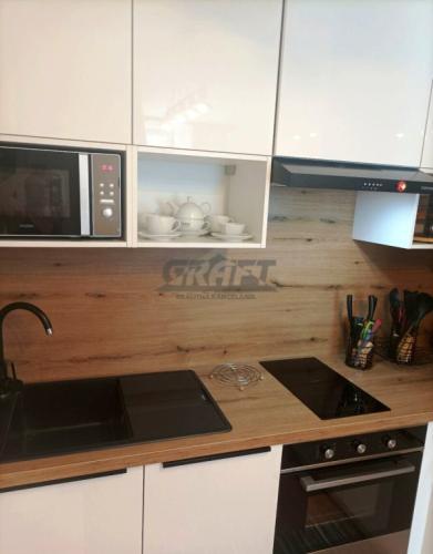 Kuchyňa ponúka indukčnú varnú dosku, teplovzdušnú rúru, umývačku riadu, chladničku s mrazničkou, mikrovlnnú rúru, rýchlovarnú kanvicu a plné kuchynské vybavenie vrátane riadu, príborov a hrncov.