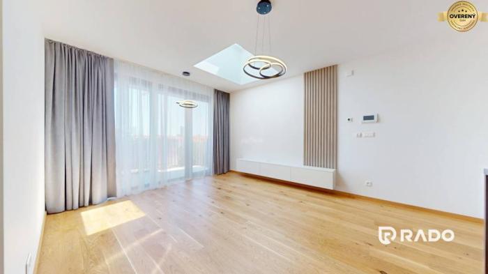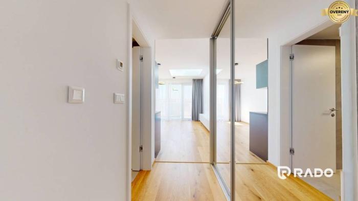 Predstavte si život v centre mesta. Vychádzate z výťahu na najvyššom siedmom poschodí, otvárate dvere do svojho nového bytu a zrazu viete, že ste doma. Obývačka plná svetla vďaka strešnému svetlíku a balkónu, ktorý vám ponúka pohľad na upravené vnútrobloky, vás okamžite pozýva vychutnať si ticho vo výške. Moderná kuchyňa je súčasťou hlavného obytného priestoru, oddelená len dispozíciou – ideálna na víkendové varenie aj večerné víno pri západe slnka. Spálňa je kompaktná, ale útulná, s miestom pre vstavanú skriňu. Kúpeľňa s vaňou, WC, vstupná chodba s priestorom na šatník – všetko má svoje miesto. V byte vás v lete príjemne schladí stropné chladenie, v zime zahreje podlahové kúrenie, a elektrické žalúzie sa postarajú o ideálnu mieru súkromia aj tieňa. Drevené parkety, kvalitné obklady, sanita a interiérové dvere dotvárajú štýl mestského komfortu. Bonusom je pivnica a možnosť dokúpenia garážového státia priamo v podzemí.