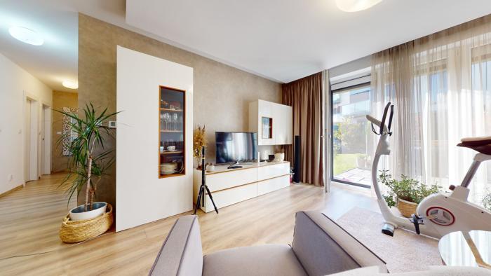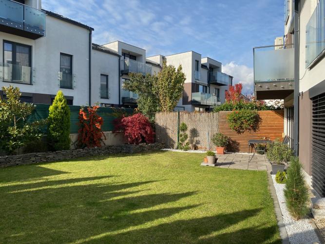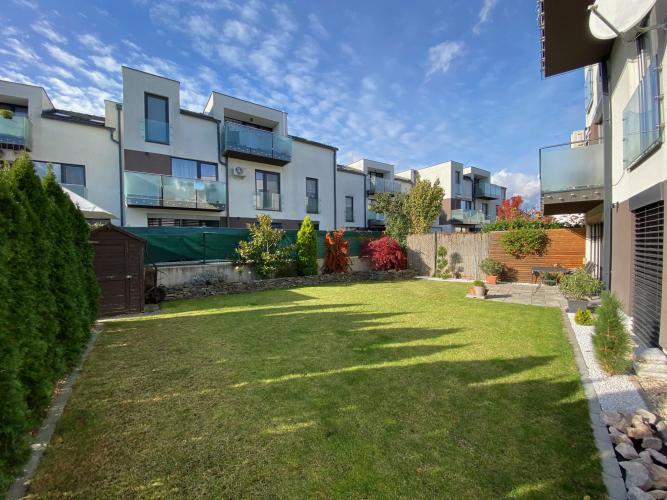 Integrálnym prepojením interiéru a exteriéru bytu a zároveň jedinečným benefitom bytu je starostlivo udržiavaná záhrada s terasou, ktorá kvalitu bývania v byte posúva na úroveň porovnateľnú s bývaním v klasickom rodinnom dome ...V letných mesiacoch sa záhrada s terasou stáva nezameniteľným miestom na relax a príjemné posedenia s priateľmi ....Záhrada je vybavená závlahovým systémom a „domčekom“ na odkladanie záhradného náradia.