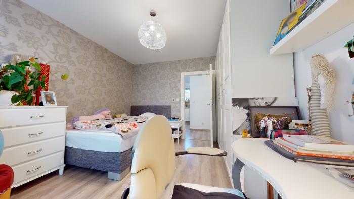 Interiér bytu je prevedený v elegantnom, nadčasovom štýle s dôrazom na prepracovanosť detailov. Atmosféru dotvárajú stropné podhľady so štýlovým osvetlením, kamenný obklad v kuchynskej časti, dizajnové tapety, na mieru vyrobená kuchynská linka vo vysokol lesku...K dispozícii je komfortná kúpeľňa s vaňou a s odkladacím priestorom, úložný priestor v byte je riešený formou šatníkových systémov „rolldoor“ vo vstupnej časti bytu, v kúpeľni a v jednej zo spálni.... v druhej spálni je klasická šatníková trojdverová skriňa.