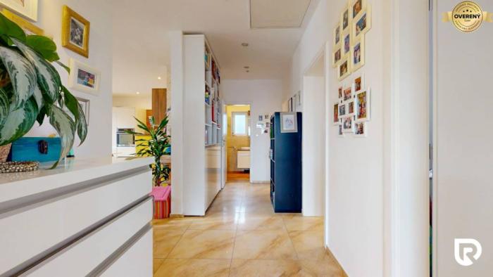 Vstupná chodba ťa rovnou čiarou privedie do kúpeľne s vaňou. Cestou je byt prirodzene rozdelený na dennú a nočnú časť. Na pravej strane sa nachádzajú 3 samostatné spálne, na ľavej strane obývačka prepojená s kuchyňou a jedálňou. Z obývacej izby je dvojitý vstup na terasu, ktorá funguje ako plnohodnotná letná obývačka aj jedálenský priestor.