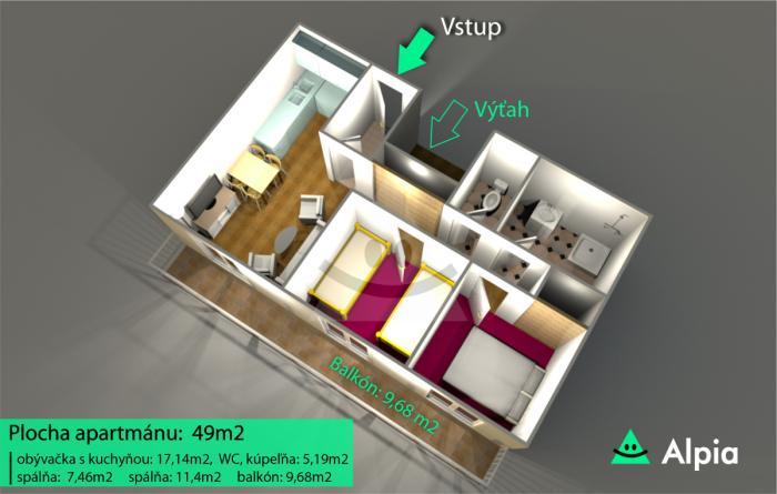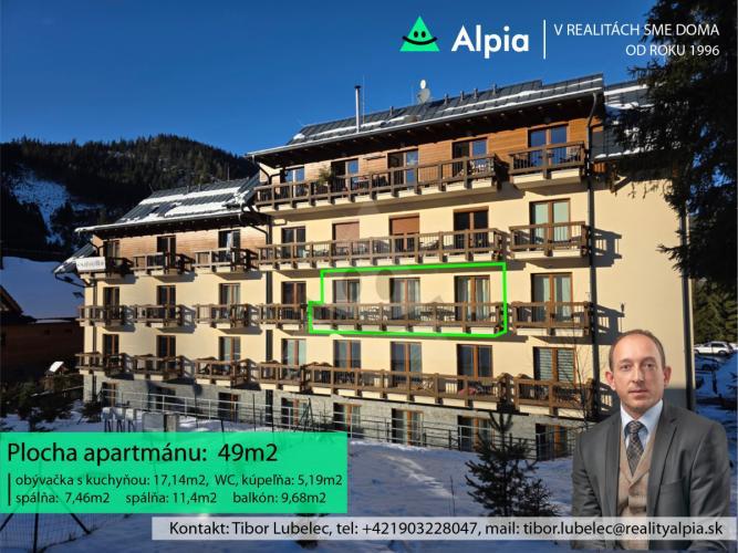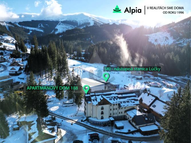 ALPIA Reality v exkluzívnom zastúpení ponúka na predaj apartmán s rozlohou 49,14 m² a 9,86m2 balkónom v Apartmánovom dome 188 len cca 2 min chôdze od nástupnej stanice Lúčky – Vyhliadka v lyžiarskom stredisku SKI Jasná.Hlavné výhody apartmánu:• Lokalita: Apartmán sa nachádza na 2 poschodí s výťahom a situovaním na južnú stranu, len niekoľko minút pešo od nástupu na sedačkovú lanovku. Vďaka tomu si môžete vy alebo hostia naplno užívať lyžovačku bez nutnosti dlhého presunu.• Vysoká obsadenosť: Apartmán je obsadzovaný celoročne, čo z neho robí výbornú investičnú príležitosť.• Parkovanie: K apartmánu prislúcha jedno parkovacie miesto zdarma.• Lyžiareň: Nachádza sa priamo v budove s oddeleným vstupom mimo hlavného vchodu a je prepojená so vstupnou chodbou s výťahom na jednotlivé poschodia. Vstup je zabezpečený kartovým systémom. Pre apartmán je vyhradený uzamykací stojan na 4-páry lyží a taktiež sušič na lyžiarky.