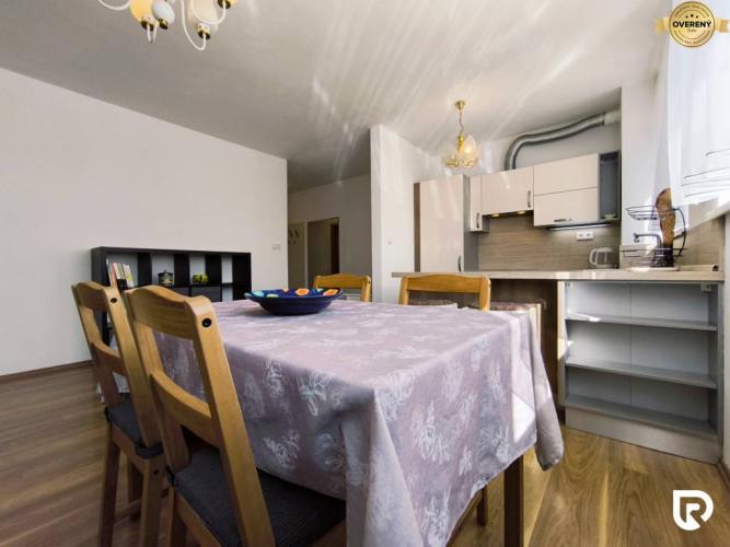 Kuchyňa je vybavená modernou kuchynskou linkou so vstavanými spotrebičmi, barovým pultom a jedálenským stolom - ideálne miesto na spoločné varenie aj večerné posedenia.