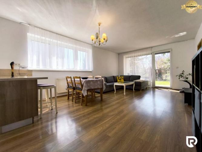 Dominantou bytu je veľká obývacia izba prepojená s kuchyňou, z ktorej je priamy vstup na terasu a do záhrady.