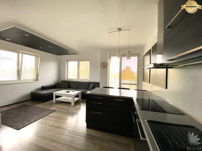 * priestranná obývacia izba prepojená s kuchyňou a vstupom na balkón