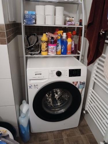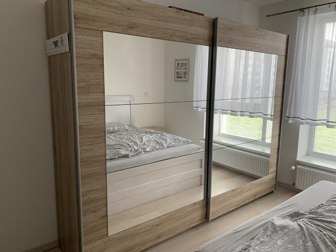 Byt obsahuje predsieň s vešiakovou stenou, kúpeľňu s vaňou, WC, pračkou, jednu samostatnú izbu, manželskú postel, nočné stolíky a skriňu, kuchyňu vybavenú kuchynskou linkou so spotrebičmi, chladničku, pračku, na oknách sú žaluzie a siete proti hmyzu, veľká obývačka.