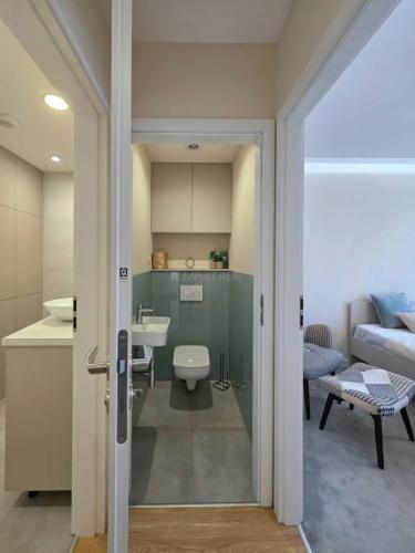 - murované jadro a toaleta (vaňa so zástenou, umývadlo so skrinkou na mieru, šikovný skrytý dodatočný úložný priestor, práčka, toaleta geberit, umývadielko)
