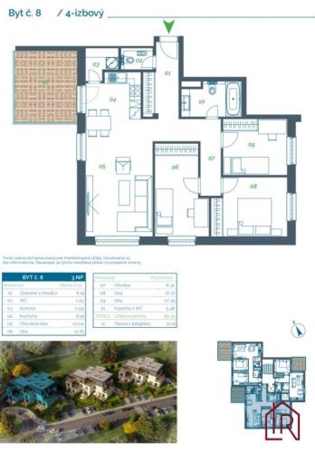 - 4 izbový byt, 89,39m2 + terasa 12,19m2 s orientáciou na 3 svetové strany (západ- terasa, obývačka s kuchyňou- západ, juh, spálne- východ, juh)