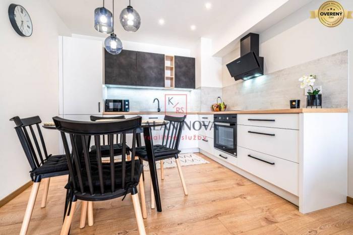 Kuchynská časť – kompletné vybavenie kuchyne, vstavané spotrebiče (indukčná varná doska, elektrická rúra, digestor, chladnička s mazničkou a umývačka riadu + voľne stojaca mikrovlnná rúra),