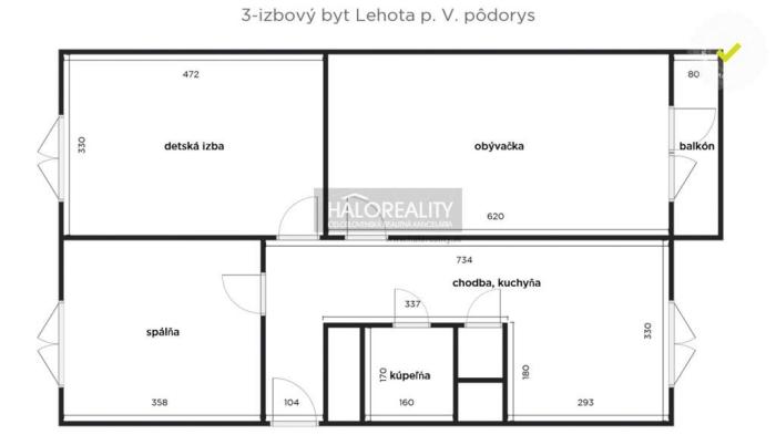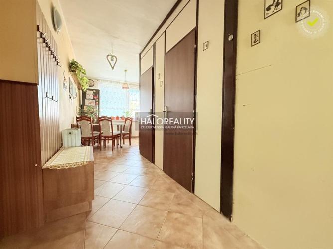 Vstupná chodba, tri nepriechodné izby (obývačka s výstupom na balkón), chodba, kúpeľňa, samostatné WC, kuchyňa s jedálenským kútom.
