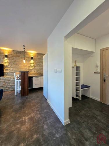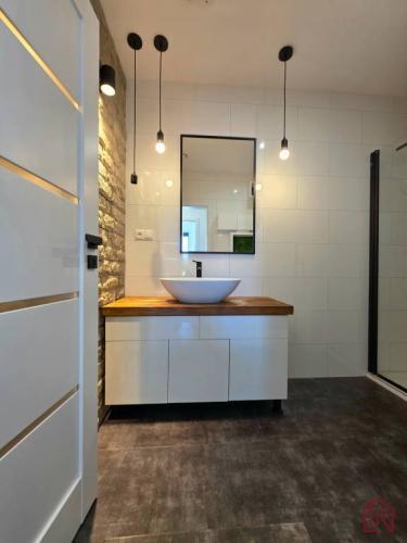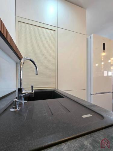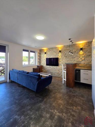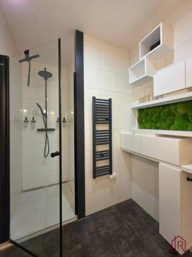 Interiér bytu bol navrhnutý s dôrazom na moderný dizajn a kvalitné materiály. Nájdete tu vinylové podlahy v antracitovej farbe, štýlový kamenný obklad v obývačke a kúpeľni a znížené sadrové stropy s bodovým osvetlením. Kúpeľňa s dekoračným machom a drevom je vybavená luxusným stropným sprchovacím kútom. Toaleta typu Geberit s malým umývadlom má rovnaký dizajnový rukopis. Bezpečnosť zaisťujú kvalitné protipožiarne vstupné dvere.