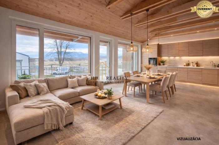 Tento apartmán pod Tatrami vyniká svojou jedinečnou atmosférou. Charakter priestoru dotvárajú drevené trámy na strope a drevené obloženie stien, ktoré prinášajú pocit tepla, útulnosti a spojenia s horským prostredím. V kombinácii s moderným zariadením (podľa vizualizácie) môže vzniknúť harmonický priestor spájajúci tradičný horský štýl s moderným komfortom.