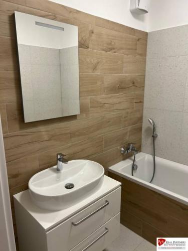 Kúpeľňa: elegantná s vaňou a umývadlom so skrinkou.