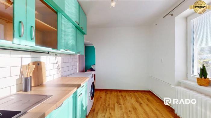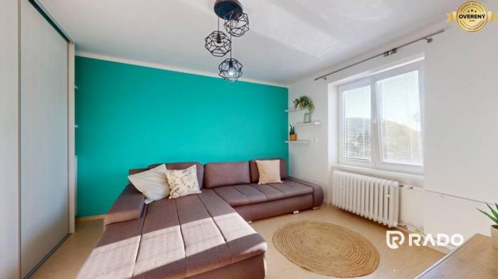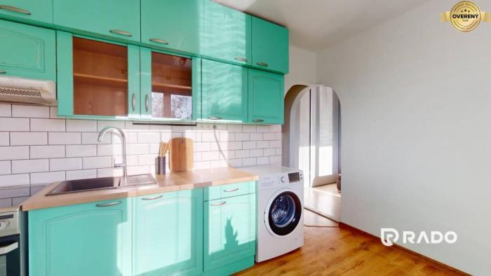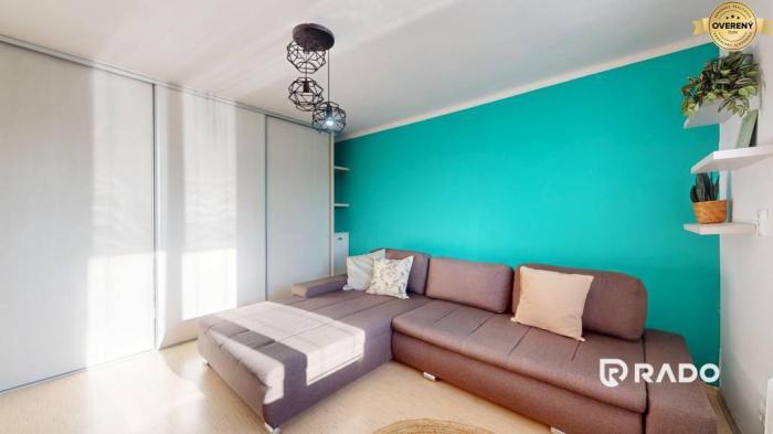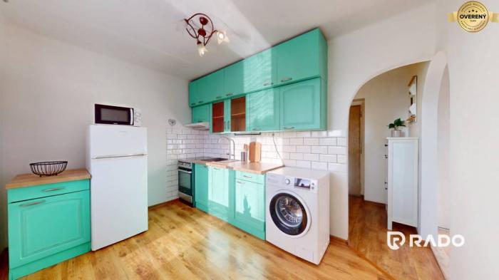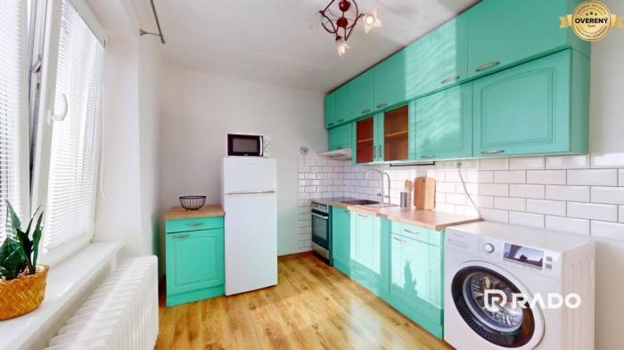 Dispozíciu tvorí vstupná chodba s komodou, samostatná, priestranná a svetlá kuchyňa so zaujímavou zelenou kuchynskou linkou, spotrebičmi vrátane práčky, samostatne stojacej chladničky s mrazničkou, mikrovlnky a elektrickej rúry so sklokeramickou varnou doskou. Obývacia izba so štýlovými doplnkami, veľkou rozkladacou sedačkou, televízorom a vstavanými skriňami pôsobí veľmi útulne. Moderná kúpeľňa s vaňou spojená s toaletou a kvalitné materiály dodávajú bytu nadčasový charakter.