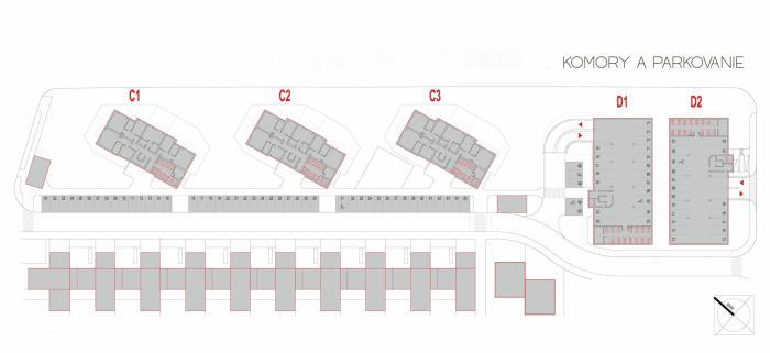 V obytnej lokalite je navrhnutých 98 vonkajších parkovacích miest pre obyvateľov bytových domov C1, C2 a C3 s prípravou na nabíjanie elektromobilov. Parkovanie nie je v cene bytu, je možné si ho dokúpiť.
