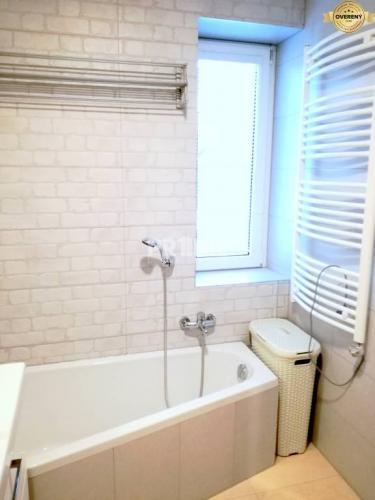 - Kúpeľňa s oknom (umývadlová skrinka so zrkadlom, vaňa, sprcha, práčka)
