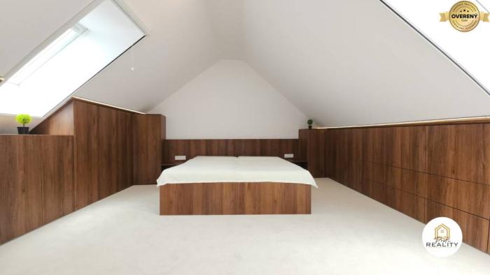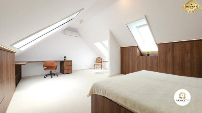 - Kúpeľňa a WC sa nachádza v zadnej časti bytu, je vybavená vaňou. Priestranná spálňa s pracovňou sa nachádza v podkrovnej časti bytu (42 m²) a je dostatočne presvetlená strešnými oknami. Obývačka a podkrovná časť bytu je vybavená klimatizáciou.