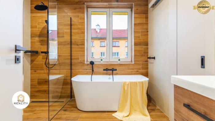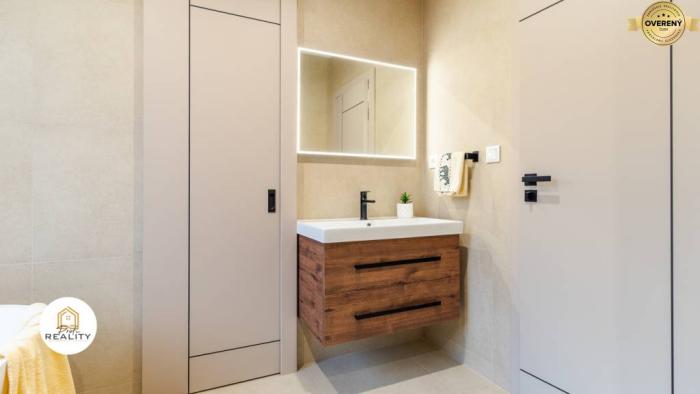 - Byt disponuje vlastným el. tepelným čerpadlom pre ohrev vody, kúrenie i chladenie klimatizáciou s prídavným stropným infrapanelom v kúpeľni.