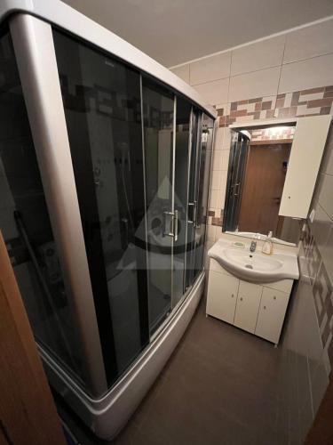 kúpeľňa s vaňou a sprchovým kútom s masážnou funkciou