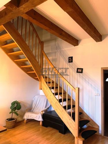 podlažie: galéria, kúpeľňa s vaňou a WC, 3 samostatné spálne. Byt pôsobí dojmom rodinného domu s vysokými stropmi.