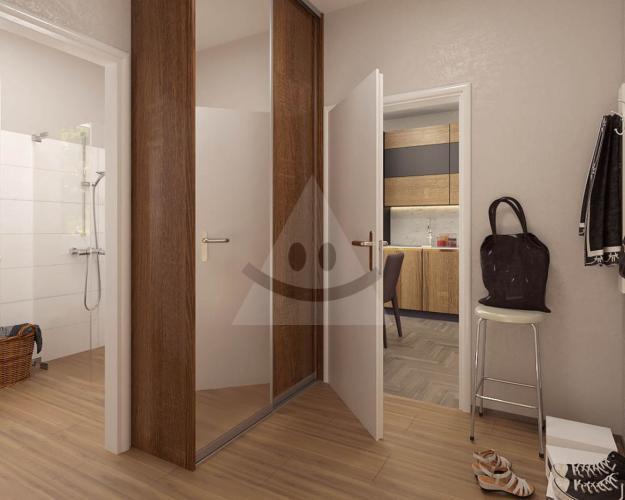 Dispozične byt pozostáva zo vstupnej chodby, kúpeľne so sprchovým kútom a WC, kuchyne a priestrannej izby so šatníkom a výstupom na balkón.