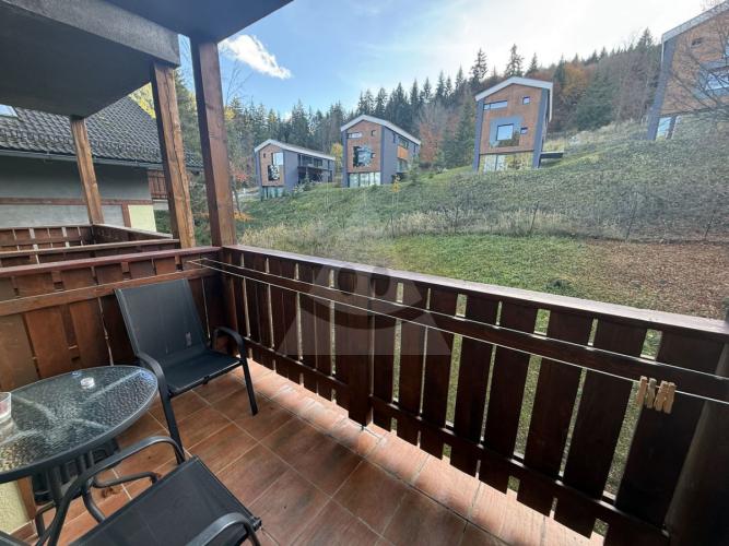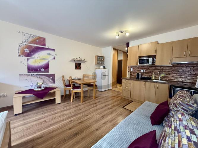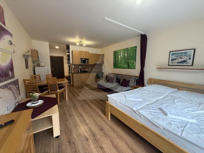 Interiér je vkusne zariadený a pozostáva z obytného priestoru s kuchynským kútom, kúpeľne s WC, šatníka a balkóna, ktorý ponúka ideálne miesto na rannú kávu či večerný oddych po dni plnom zážitkov.