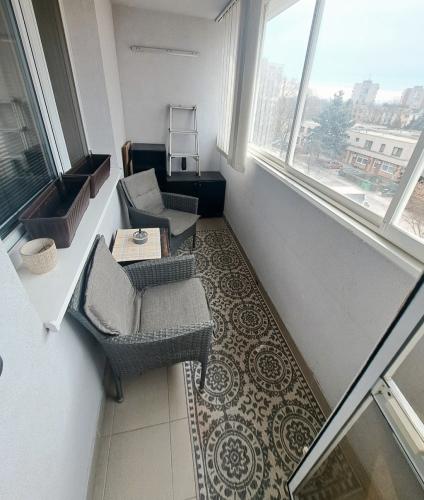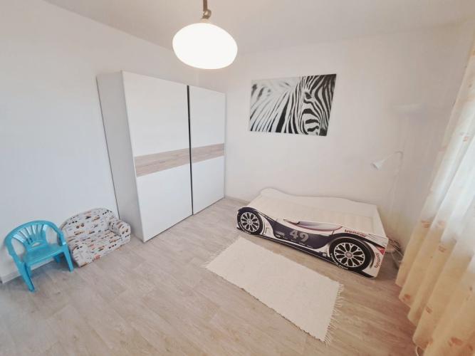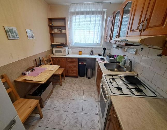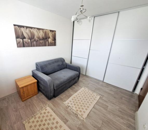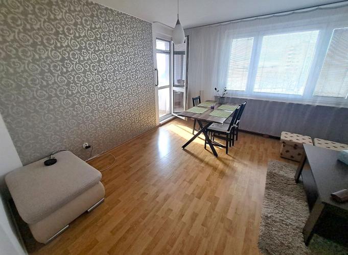 VYBAVENIE BYTU: Byt sa prenajíma zariadený bez TV, vo vstupnej chodba sú skrine, obývačka je zariadená veľkou rohovou sedačkou, komodami, konferenčným stolíkom, jedálenským stolom. Kuchyňa je vybavená riadom, je v nej sporák, kuchynské sedenie, chladnička, sporák. V jednej z izieb sa nachádza rozkladacia sedačka, nočný stolík a vstavané skrine, druhá izba je zariadená ako detská izba, s posteľou a skriňou. Práčka je umiestnená v samostatnom WC. Kúpeľňa s oknom disponuje vaňou a umývadlom so skrinkou. Na lodžiu je vstup z obývacej izby, je zasklená a zariadená skrinkami a sedením so stolíkom.