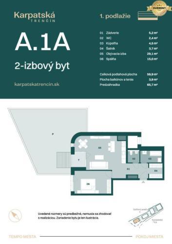 RADO Reality ponúka na predaj výnimočný 2-izbový byt s označením A.1A, ktorý spája špičkový dizajn, moderné technológie a nadštandardné riešenia pre komfortné a ekologické bývanie. Byt sa nachádza v budove A, v lukratívnej lokalite Trenčína, na 1. nadzemnom podlaží a jeho interiér má rozlohu 59,9 m². K nemu patrí aj priestranný exteriér s rozlohou 69,6 m² – ide o kombináciu balkóna/terasy (3,9 m²) a predzáhradky (65,7 m²), ktorá poskytuje absolútne súkromie, priestor na relax aj zázemie pre rodinu.