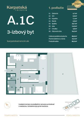 RADO Reality ponúka na predaj výnimočný 3-izbový byt s označením A.1C, ktorý spája špičkový dizajn, moderné technológie a nadštandardné riešenia pre komfortné a ekologické bývanie. Byt sa nachádza v budove A, v lukratívnej lokalite Trenčína, na 1. nadzemnom podlaží a jeho interiér má rozlohu 88,8 m². K nemu patrí aj priestranný exteriér s rozlohou 95,7 m² – ide o kombináciu terasy (15,4 m²) a predzáhradky (80,3 m²), ktorá poskytuje absolútne súkromie, priestor na relax aj zázemie pre rodinu.