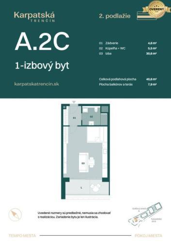 RADO Reality ponúka na predaj výnimočný 1-izbový byt s označením A.2C, ktorý spája špičkový dizajn, moderné technológie a nadštandardné riešenia pre komfortné a ekologické bývanie. Byt sa nachádza v budove A, v lukratívnej lokalite Trenčína, na 2. nadzemnom podlaží a jeho interiér má rozlohu 40,6 m². K nemu patrí aj exteriér s rozlohou 7,9 m² – ide o terasu, ktorá poskytuje absolútne súkromie, priestor na relax aj zázemie pre rodinu.