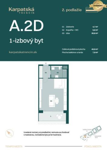 RADO Reality ponúka na predaj výnimočný 1-izbový byt s označením A.2D, ktorý spája špičkový dizajn, moderné technológie a nadštandardné riešenia pre komfortné a ekologické bývanie. Byt sa nachádza v budove A, v lukratívnej lokalite Trenčína, na 2. nadzemnom podlaží a jeho interiér má rozlohu 40,9 m². K nemu patrí aj exteriér s rozlohou 7,9 m² – ide o terasu, ktorá poskytuje absolútne súkromie, priestor na relax aj zázemie pre rodinu.