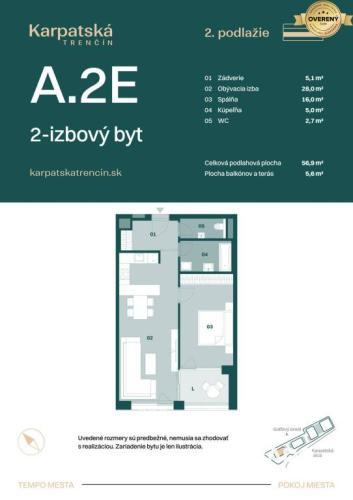 RADO Reality ponúka na predaj výnimočný 2-izbový byt s označením A.2E, ktorý spája špičkový dizajn, moderné technológie a nadštandardné riešenia pre komfortné a ekologické bývanie. Byt sa nachádza v budove A, v lukratívnej lokalite Trenčína, na 2. nadzemnom podlaží a jeho interiér má rozlohu 56,9 m². K nemu patrí aj exteriér s rozlohou 5,6 m² – ide o terasu, ktorá poskytuje absolútne súkromie, priestor na relax aj zázemie pre rodinu.