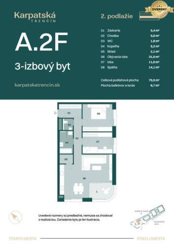 RADO Reality ponúka na predaj výnimočný 3-izbový byt s označením A.2F, ktorý spája špičkový dizajn, moderné technológie a nadštandardné riešenia pre komfortné a ekologické bývanie. Byt sa nachádza v budove A, v lukratívnej lokalite Trenčína, na 2. nadzemnom podlaží a jeho interiér má rozlohu 75,5 m². K nemu patrí aj exteriér s rozlohou 6,7 m² – ide o terasu, ktorá poskytuje absolútne súkromie, priestor na relax aj zázemie pre rodinu.