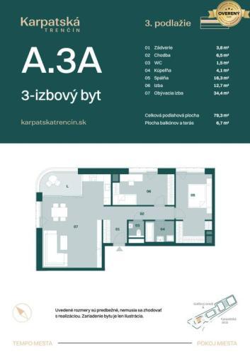 RADO Reality ponúka na predaj výnimočný 3-izbový byt s označením A.3A, ktorý spája špičkový dizajn, moderné technológie a nadštandardné riešenia pre komfortné a ekologické bývanie. Byt sa nachádza v budove A, v lukratívnej lokalite Trenčína, na 3. nadzemnom podlaží a jeho interiér má rozlohu 79,3 m². K nemu patrí aj exteriér s rozlohou 6,7 m² – ide o terasu, ktorá poskytuje absolútne súkromie, priestor na relax aj zázemie pre rodinu.