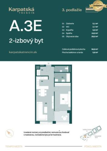 RADO Reality ponúka na predaj výnimočný 2-izbový byt s označením A.3E, ktorý spája špičkový dizajn, moderné technológie a nadštandardné riešenia pre komfortné a ekologické bývanie. Byt sa nachádza v budove A, v lukratívnej lokalite Trenčína, na 3. nadzemnom podlaží a jeho interiér má rozlohu 56,9 m². K nemu patrí aj exteriér s rozlohou 5,6 m² – ide o terasu, ktorá poskytuje absolútne súkromie, priestor na relax aj zázemie pre rodinu.