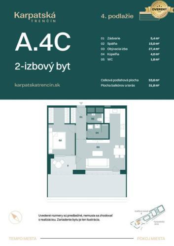 RADO Reality ponúka na predaj výnimočný 2-izbový byt s označením A.4C, ktorý spája špičkový dizajn, moderné technológie a nadštandardné riešenia pre komfortné a ekologické bývanie. Byt sa nachádza v budove A, v lukratívnej lokalite Trenčína, na 4. nadzemnom podlaží a jeho interiér má rozlohu 53,6 m². K nemu patrí aj priestranný exteriér s rozlohou 31,8 m² – ide o terasu, ktorá poskytuje absolútne súkromie, priestor na relax aj zázemie pre rodinu.