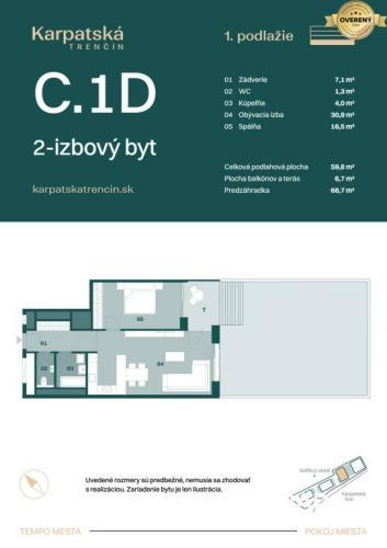 Byt sa nachádza v bytovom dome C, v exkluzívnom projekte Rezidencia Karpatská, situovaný v jednej z najžiadanejších častí Trenčína. Nachádza sa na 1. nadzemnom podlaží, má interiérovú plochu 59,98 m² a jeho veľkým benefitom je exteriér s celkovou výmerou 75,32 m², ktorý pozostáva z terasy o rozlohe 6,6 m² a rozľahlej predzáhradky s výmerou 68,7 m² – ideálny priestor na oddych, zeleň či menšiu záhradku.
