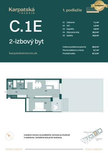 IBA U NÁS! RADO Reality ponúka na predaj 2-izbový byt C.1E v bytovom dome C, v jedinečnom rezidenčnom projekte Rezidencia Karpatská, ktorý vyrastá v prestížnej a tichej lokalite na ulici Karpatská, Trenčín. Ideálne riešenie pre pár, jednotlivca, mladú rodinu či ako výborná investícia – spojenie komfortu, moderných technológií a nadčasovej architektúry.