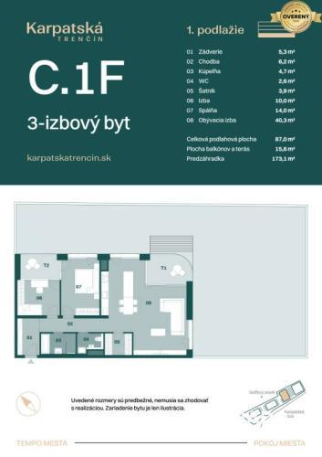 IBA U NÁS! RADO Reality ponúka na predaj 3-izbový byt C.1F v bytovom dome C, v jedinečnom rezidenčnom projekte Rezidencia Karpatská, ktorý vyrastá v prestížnej a tichej lokalite na ulici Karpatská, Trenčín. Ideálne riešenie pre pár, jednotlivca, mladú rodinu či ako výborná investícia – spojenie komfortu, moderných technológií a nadčasovej architektúry.