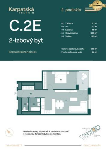 IBA U NÁS! RADO Reality ponúka na predaj 2-izbový byt s označením C.2E v bytovom dome C, s interiérovou plochou 59,8 m² a loggiou o rozlohe 6 m² – výnimočné riešenie, ktoré ponúka dostatok priestoru na relax i pohodlné bývanie. Byt sa nachádza na 2. podlaží v exkluzívnom projekte Rezidencia Karpatská, ktorý vzniká v jednej z najlukratívnejších častí Trenčína. Dispozícia bytu je 2+kk, ideálna pre jednotlivca, pár alebo ako výhodná investícia.