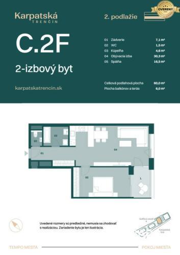 IBA U NÁS! RADO Reality ponúka na predaj 2-izbový byt s označením C.2F v bytovom dome C, s interiérovou plochou 60 m² a loggiou o rozlohe 6 m² – výnimočné riešenie, ktoré ponúka dostatok priestoru na relax i pohodlné bývanie. Byt sa nachádza na 2. podlaží v exkluzívnom projekte Rezidencia Karpatská, ktorý vzniká v jednej z najlukratívnejších častí Trenčína. Dispozícia bytu je 2+kk, ideálna pre jednotlivca, pár alebo ako výhodná investícia.