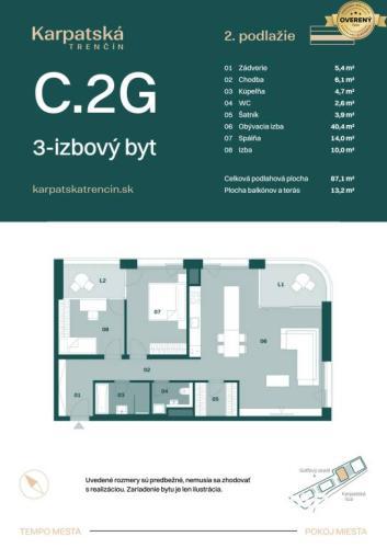 IBA U NÁS! RADO Reality ponúka na predaj 3-izbový byt s označením C.2G v bytovom dome C, s veľkorysou interiérovou plochou 87,19 m² a dvomi loggiami s rozlohou 13,24 m² – výnimočné kombinované riešenie, ktoré poskytuje viacero možností na trávenie voľného času. Byt sa nachádza na 2. podlaží v exkluzívnom projekte Rezidencia Karpatská, ktorý vyrastá v jednej z najlukratívnejších častí Trenčína. Dispozícia bytu je praktická a vzdušná – 3+kk, ideálna pre pár, rodinu alebo ako investícia.