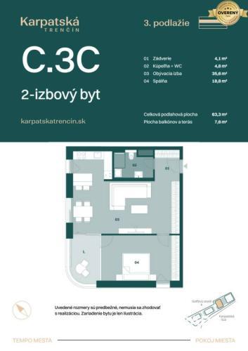 IBA U NÁS! RADO Reality ponúka na predaj 2-izbový byt s označením C.3C v bytovom dome C, nachádzajúci sa na 3. podlaží exkluzívneho projektu Rezidencia Karpatská, situovaného v jednej z najlukratívnejších častí Trenčína.