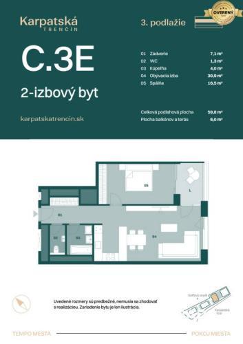 IBA U NÁS! RADO Reality ponúka na predaj 2-izbový byt s označením C.3E v bytovom dome C, nachádzajúci sa na 3. podlaží exkluzívneho projektu Rezidencia Karpatská, ktorý vyrastá v jednej z najlukratívnejších častí Trenčína.