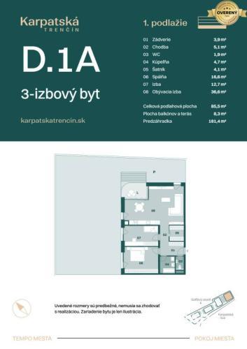 IBA U NÁS! RADO Reality ponúka na predaj výnimočný 3-izbový byt s označením D.1A, ktorý spája špičkový dizajn, moderné technológie a nadštandardné riešenia pre komfortné a ekologické bývanie. Byt sa nachádza v budove D, v lukratívnej lokalite Trenčína, na 1. nadzemnom podlaží a jeho interiér má rozlohu 85,46 m². K nemu patrí aj priestranný exteriér s rozlohou 189,76 m² – ide o kombináciu terasy a predzáhradky, ktorá poskytuje absolútne súkromie, priestor na relax aj zázemie pre rodinu.