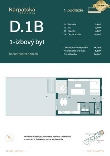Ak hľadáte nadčasové bývanie v prémiovej lokalite s dôrazom na moderné technológie, komfort a udržateľnosť, byt D.1B v Rezidencii Karpatská je správna voľba. Kontaktujte nás pre viac informácií alebo osobné stretnutie.